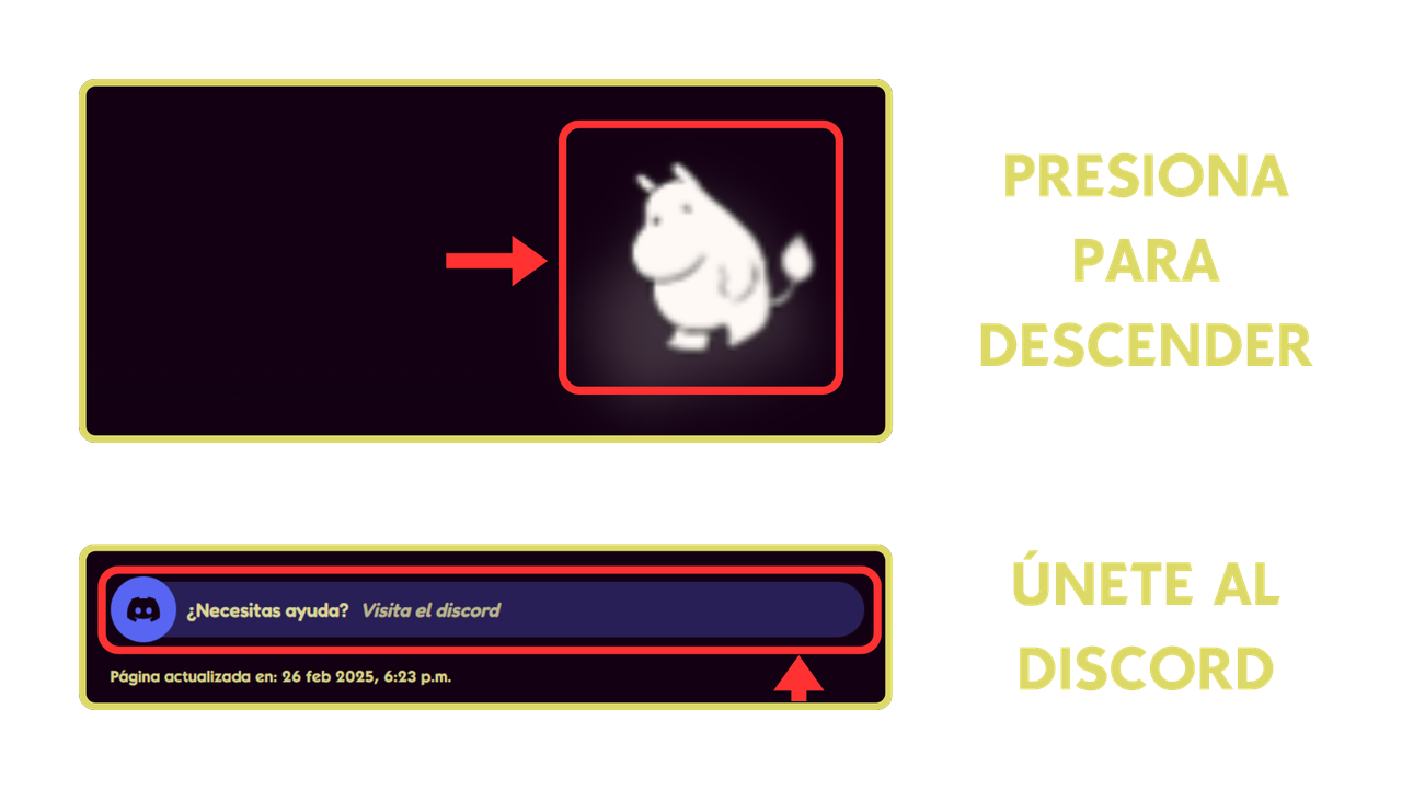 ¿Necesitas ayuda? Presiona el chiquitín flotante, descenderás hasta encontrar el botón de nuestro Discord, únete y solicita ayuda.