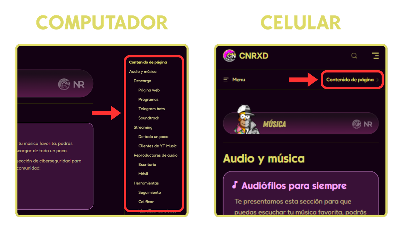 El contenido (o índice) muestra todo el contenido disponible en cada sección, lo encuentras en la parte superior derecha.